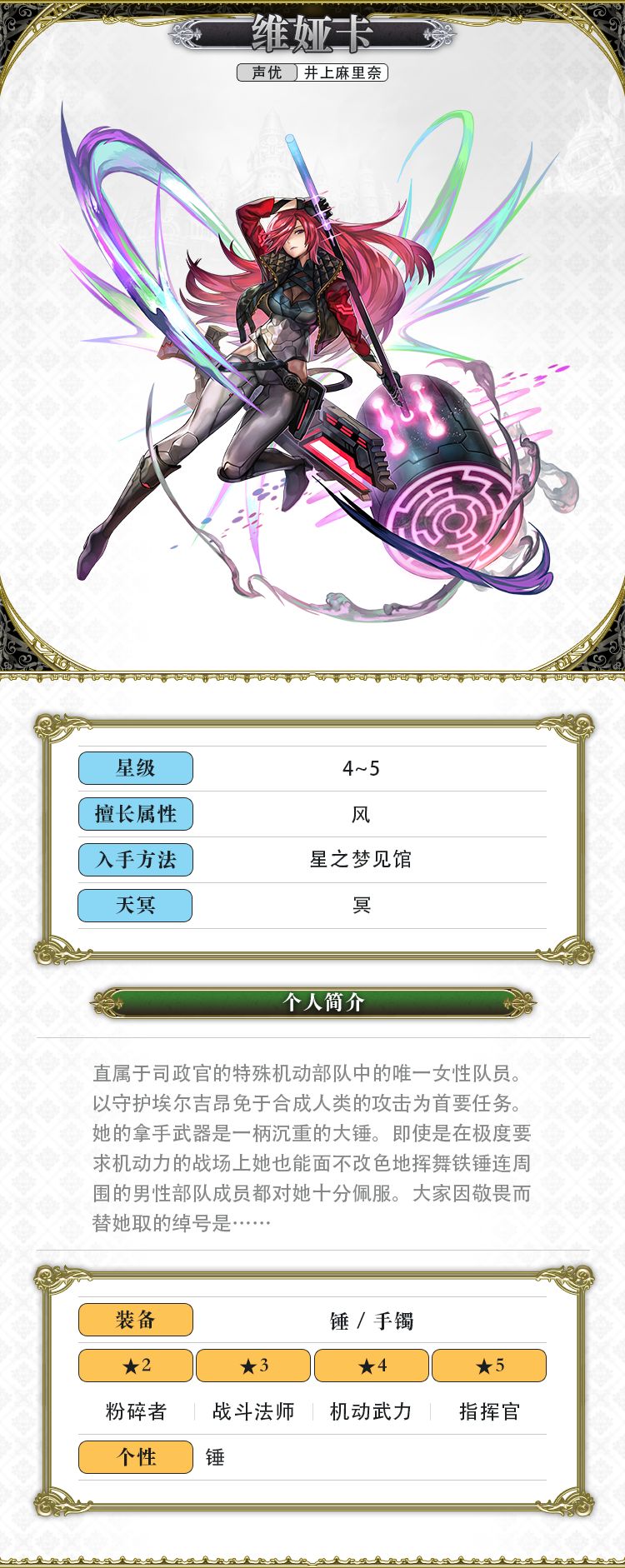 另一个伊甸维娅卡技能怎么样?另一个伊甸即将推出新4星角色维娅卡,很多玩家玩家非常关注她的技能,下面就为大家带来另一个伊甸维娅卡技能换阵咏唱介绍。 另一个伊甸维娅卡技能换阵咏唱介绍换阵咏唱 LV1 - 【前线就交给我吧!我来追击!】 我方全体力量10%UP+全体敌人智力10%DOWN(1回合) LV2 - 【我是……已经和过去诀别的女人!】 我方全体力量20%UP+全体敌人智力15%DOWN(1回合) LV3 - 【约定的未来…将由我来开拓!】 我方全体力量30%UP+全体敌人智力20%DOWN(1回合) 技能介绍 固定技能 【风之奇袭】魔法值:20 给予单一敌人风属性打攻击(小) +风属性耐性20%DOWN(3回合) 【光辉重击】魔法值:42 给予单一敌人风属性打攻击(大) +风属性耐性25%DOWN(3回合) 【反攻重击】魔法值:54 给予单一敌人2次风属性打攻击(特大) +风属性耐性30%DOWN (3回合) 学习技能 【疾风猛击】魔法值:12 给予敌方单体风属性打攻击(小) 进阶为★2【粉碎者】后开启 【闪电冲击】魔法值:17 给予全体敌人打攻击(小) +附加昏厥效果 进阶为★3【战斗法师】后开启 【烈风突击】魔法值:11 自身力量20%UP+速度20%UP (2回合) 进阶为★3【战斗法师】后开启 【疾风之力】魔法值:37 给予单一敌人风属性打攻击(大) +自身风属性攻击力20%UP (3回合 最多可累积3次) 进阶为★4【机动武力】后开启 【三重风翼】魔法值:47 自身力量50%UP (1回合) +下次行动时给予单一敌人3次风属性打攻击(特大) 进阶为★5【指挥官】后开启 |