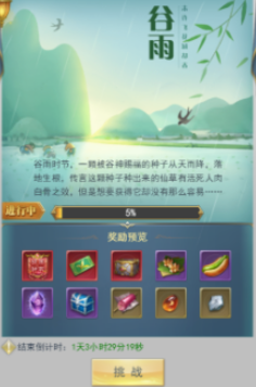 活动期间,将开启谷神赐福、雨前新茶、谷雨好礼三项内容。