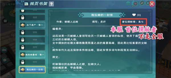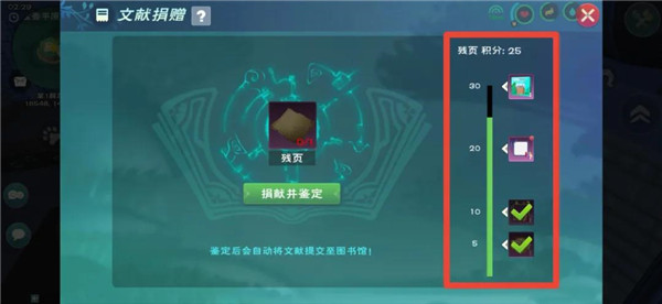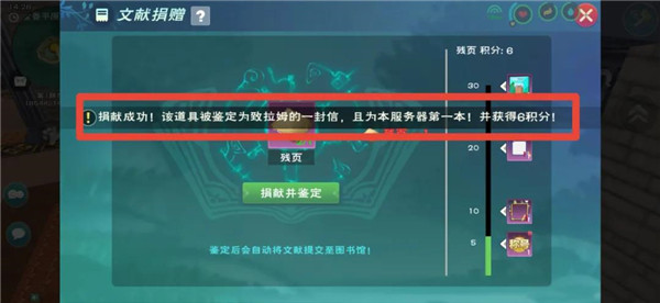 创造与魔法贝雅图书馆奖励有什么?贝雅图书馆是创造与魔法新增加的玩法,奖励还是非常不错的,小编来为玩家们展示下贝雅图书馆的奖励,以及积分规则。 积分规则: 1、如果捐献的文献是本服第一本的话,可以获得6积分! 同时文献中会在首位捐献者处记录下该服第一位捐献该文献的玩家名称: 2、如果捐献的文献已经存在,则只获得1积分!3、积分达到特定数值后,就可以获得相应的奖励。4、若积分已达到最大值,仍可继续捐献,但积分不再累积。 奖励展示 1、称号-博古通今 积分需求:5积分 2、头像框-博古通今 积分需求:10积分 3、气泡-博古通今 积分需求:20积分 4、背饰-书生行囊 积分需求:30积分 另外,游戏内还新增了可制作设施-残页书架,外貌与图书馆的残页书架一样: 友情提示,该物品为装饰摆设设施,不能装物品哦~ |