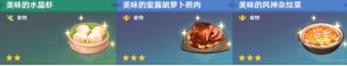 烹饪:水晶虾、风神杂烩菜、蜜酱胡萝卜煎肉。