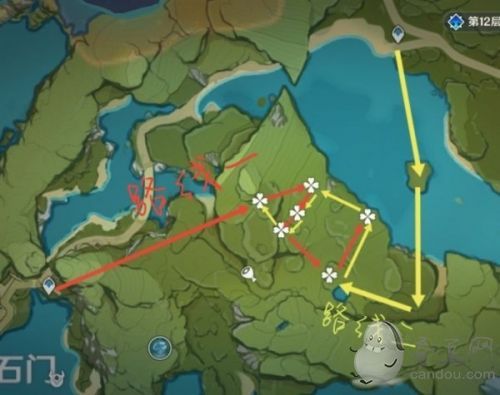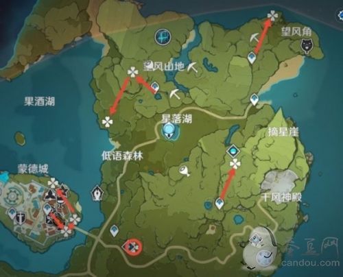 (注:第三张线路图中摘星涯附近的蒲公英,由于考虑到地势较高和旅行者体力的原因,并不推荐直接从秘境爬山上去)