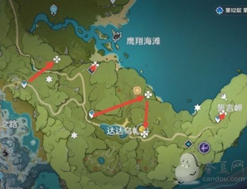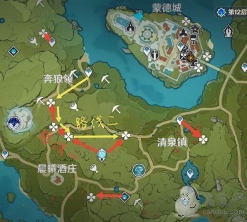 下列图标中形状为“四叶草”的即为蒲公英籽固定刷新点,每72小时刷新一次。部分区域提供了两条路线(红、黄),旅行者们可以根据个人喜好进行选择
