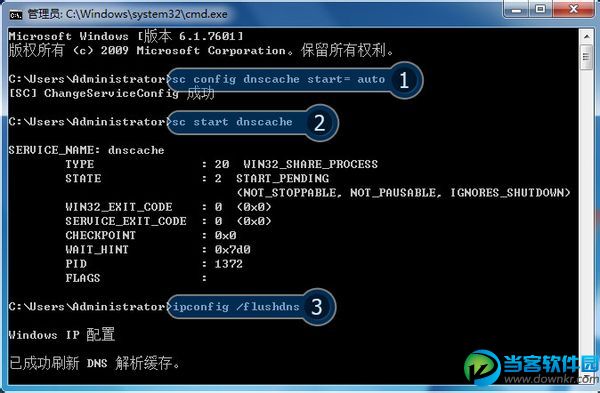 2.在弹出的黑色窗口中,输入”sc coinfig dnscache start= auto”(注意=后的空格),按键盘enter(回车)键→输入”sc start dnscache”,按键盘enter(回车)键,最后输入”ipconfig /flushdns” , 按键盘enter(回车)键: