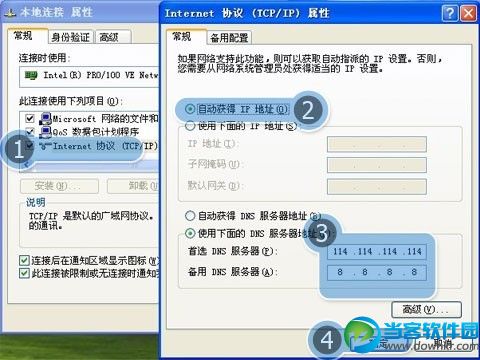 2.双击【Internet 协议(TCP/IP)】→选择【自动获取IP地址(0)】和【使用下面的DNS服务器地址(B)】→输入首选DNS服务器为"114.114.114.114",备用DNS服务器为"8.8.8.8"→点击【确定】→【确定】: