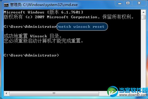2.在弹出的黑色窗口中,输入”netsh winsock reset”,按键盘enter(回车)键后重启计算机: