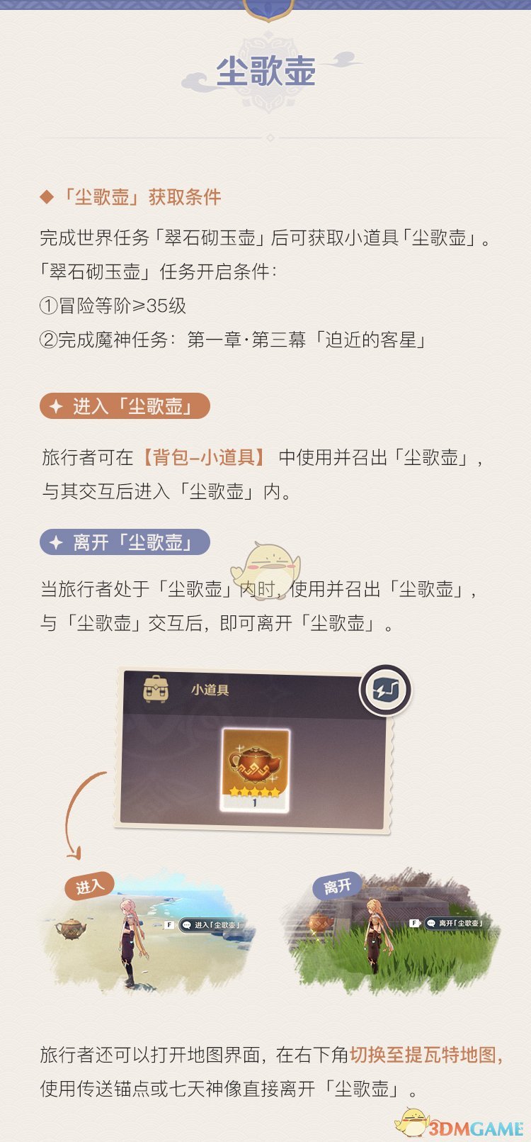 尘歌壶是《原神》中即将于1.5版本推出的一个系统,可以为玩家提供一片自己DIY的区域。尘歌壶的获取方式目前官方已经给出了相关说明,需要玩家完成叫做“翠石砌玉壶”的世界任务。具体获取条件如下所示。 《原神》尘歌壶获取方法介绍: ◆「尘歌壶」获取条件 完成世界任务「翠石砌玉壶」后可获取小道具「尘歌壶」。 「翠石砌玉壶」任务开启条件 ①冒险等阶≥35级 ②完成魔神任务:第一章·第三幕「迫近的客星」 进入「尘歌壶」 旅行者可在【背包-小道具】中使用并召出「尘歌壶」 与其交互后进入「尘歌壶」内。 离开「尘歌壶」 当旅行者处于「尘歌壶」内时,使用并召出「尘歌壶」 与「尘歌壶」交互后,即可离开「尘歌壶」。 旅行者还可以打开地图界面,在右下角切换至提瓦特地图, 使用传送锚点或七天神像直接离开「尘歌壶」。 相关攻略:丘丘梦工坊玩法介绍 |