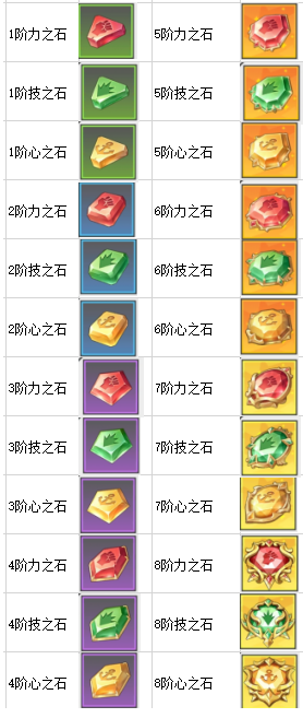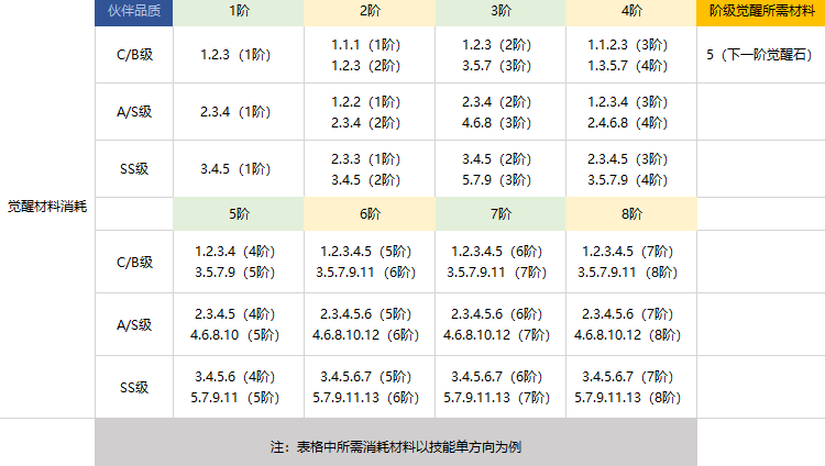 不同属性的伙伴所需要的觉醒材料是不同的,例如力属性伙伴,每次觉醒需要使用力之觉醒石。觉醒石分1~8阶,不同觉醒阶级使用对应的阶级的觉醒石。