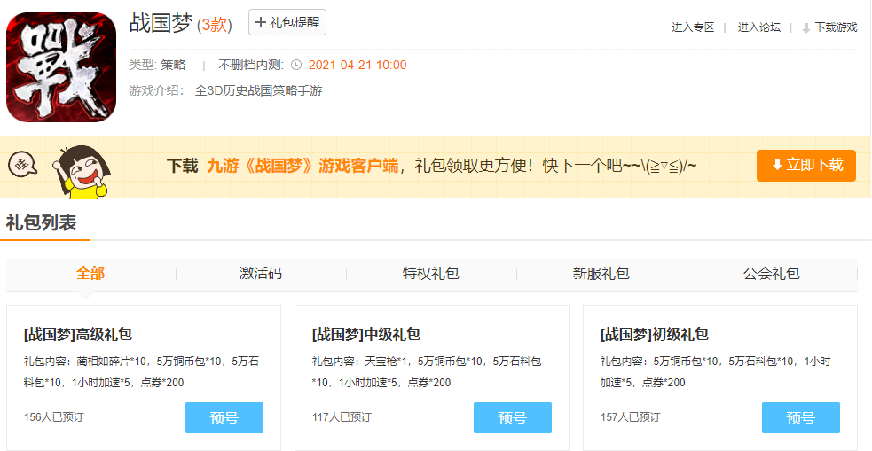 战国梦是一款以春秋战国为题材的策略战争手游,许多玩家对这款游戏也是期待不已,那么战国梦手游在哪预约呢?下面我们就一起来看一下战国梦手游的预约下载地址分享吧。 一、预约地址 目前战国梦手游已经于2021年4月21日10:00正式开服,玩家已经错过了预约时间,大家可以直接前往九游APP中进行下载了。如果大家已经在公测之前预约的话,记得再前往九游的礼包界面领取丰厚的预约奖励哦。 二、礼包分享 目前九游中有许多礼包可以领取,下面我们就一起来看一下这些礼包的内容都有哪些吧: 高级礼包:蔺相如碎片*10,5万铜币包*10,5万石料包*10,1小时加速*5,点券*200; 中级礼包:天宝枪*1,5万铜币包*10,5万石料包*10,1小时加速*5,点券*200 初级礼包:5万铜币包*10,5万石料包*10,1小时加速*5,点券*200 三、兑换方式 领取礼包后,玩家需要在游戏中,点击左上角的头像-设置-序号兑换-在输入兑换码进行兑换领取奖励哦(该礼包只能用于九游版《战国梦》,一个账号只能领取一次) |
