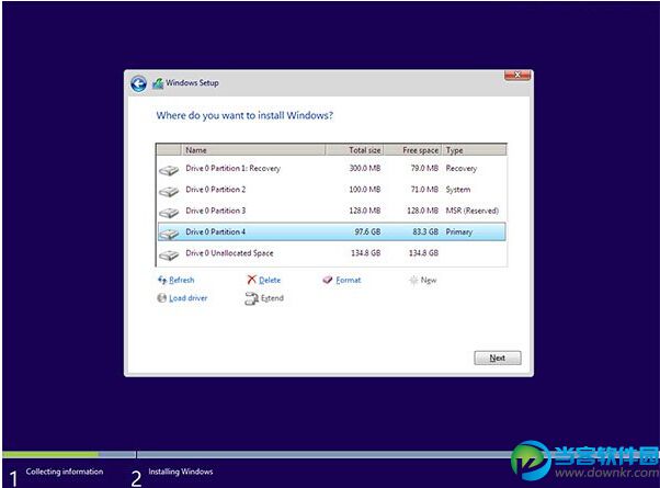 4、此时可以点击下一步,然后系统将自行分区格式化然后安装。当然您也可以手动分区,然后选择一个适合安装的分区作为主分区,点击下一步进行安装。