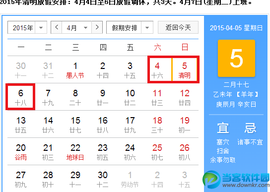 2015年清明节是4月5日星期日。根据规定周一补休。