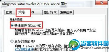 3.在打开的窗口中,切换到“策略”项,点击选择“快速删除(默认)(Q)”点击确定完成设置。如下图所示