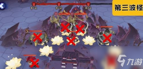 经测试全程不需要触发战斗即可通关,阿修罗右边三只小怪要打掉一只剩二只才能有足够的心言触发战意。按照我这样摆放一回合即可收掉2 3波 。