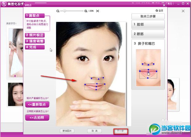 4、在弹出的窗口中在调整一下鼻子和嘴巴,调整完成以后单击下一步
