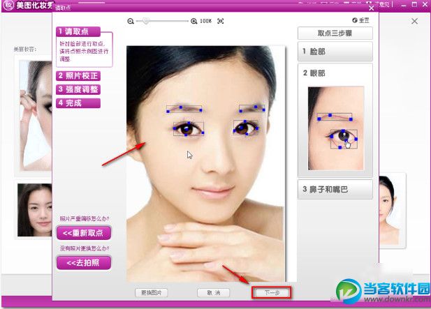2、在弹出的窗口中需要三步,调整脸部,眼部,鼻子和嘴巴,调整一下。调整好脸部以后单击下一步