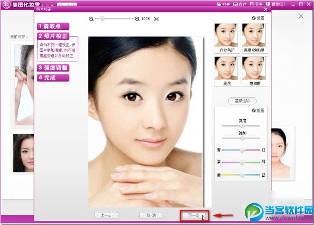 5、在弹出的窗口中调整照片的亮度和饱和度,在这里可以直接单击下一步