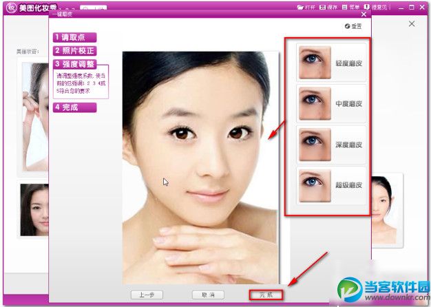 6、在弹出的窗口中美化一下脸部皮肤,此步可以直接单击完成按扭单,击完成后,就可以化妆照片了
