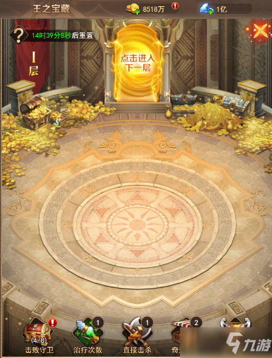 | 王之宝藏 王之宝藏为一个每2天循环1轮的常规产出玩法 玩法产出分别有: 1) 符文精华(符石兑换、符文洗练) 2) 圣物精炼石(圣物升级) 3) 钻石 4) 金币 5) 英雄碎片 6) 探宝券(幸运探宝所用) 玩法解锁条件为爵位等级达“伯爵5阶”; 每次重置后,新一轮参与需要重新选择5个角色进行参与(1主角+4英雄),主角必定上阵 圣契大陆》王之宝藏解锁新玩法" src="https://media.9game.cn/gamebase/2021/4/26/226998647.jpg" style="border: none;">  选择英雄上阵 默认点击一键上阵取含主角在内,战力最高的5名角色上阵参与 确认角色后本轮不可在变更  游戏主界面 同一轮王之宝藏玩家角色相关的数据会即时保留 举例: 上阵角色的属性不受培养而变化 战斗剩余血量及能量条信息剩余量即时保存 战斗胜负规则: 玩法中5个角色应对关卡的挑战为1V1形式(即玩家1个角色对战关卡1个角色) 战斗时间内血量先为0的一方失败; 玩家角色失败改角色不可在本轮继续使用 怪物失败,该怪物关卡被通过 每次通关后玩家角色的数据会即时保存,本轮的剩余关卡战斗继续有效 若战斗时间内双方皆未阵亡,则认定战斗超时(另一种失败) 对战超时,超时结束时的时间点,双方数据被保留,可再进行一场战斗继续对战。 关卡结构: 关卡分为若干层,每层有4只怪物,其中3个守卫和1个boss 每个怪物以明雷模型方式显示在界面中,点击模型可进行挑战 每层优先显示守卫,通过所有守卫后,刷出boss,击杀boss后进入下一层 上一轮通关的最高层数将影响下一轮重置后重新开始的起步层数 下一轮的起步层数=上一轮最高层数-配置层数 若“新一轮重置”至”再新一轮的重置”玩家完全未参与,则不启用-上一轮层数的规则   关卡掉落: 每通过1个关卡都会触发一些掉落事件 事件包含纯奖励,以及关卡内的随机(给英雄回血/直接通关/商店)等特殊事件 掉落纯奖励事件可能掉出多种奖励 治疗事件: 每从关卡掉落中获得1个治疗事件,将被记录到玩家身上,长期可存 每消耗1个治疗事件可对英雄进行1次治疗,治疗量恢复英雄50%最大生命值血量 同一期最多只能使用5次 不可对满生命值状态的英雄进行治疗  直杀事件: 每从关卡掉落中获得1个直杀事件,将被记录到玩家身上,长期可存 每消耗1个直杀事件,可直接通关1个明雷关卡 同一期最多只能使用5次 直杀事件也可以花费钻石进行购买,每轮限购5次  直杀事件界面  直杀事件购买 奇遇商店: 每触发一个奇遇商店事件,在本期可对该商店事件的道具进行购买 此处掉落出来的商品性价比较高,有一定需求和能力的玩家可自愿选择购买 奇遇商店本轮未购买的商品可累积,直至本轮重置时清除,已购的限时已购标识不可再购  阶段奖励: 根据当期玩家累计通关一定数量关卡后可获得一定的目标奖励 目标奖励需要手动领取,若系统重置时未领取系统将通过邮件发送补领奖励  |