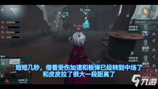 ✘还有一个细节☞开局大龙是出生在沙包废墟的 ,一开始是在沙包废墟中规中矩地进行牵制的,在吃了一刀后很聪明地接住受伤加速和板弹往大门角落拉,两个对角点能拉开很大的距离。而且开局也可以看到,大门那个点是没有人修机的,大龙在吃刀后的第一时间就想着原理遗产机,往角落、不干扰队友机子的地方倒。这一点意识很值得我们学***龙倒在角落之后皮皮就很被动了,没有镜子就没有办法干扰机子了,再加上前面大龙疯狂拉距离拉了一个对角线,从开局到大龙上椅,已经开了两台机子了。这就是为什么牵制和倒地不要往队友遗产机倒的原因——在没有监管干扰机子时,求生者的修机进度是相当快的