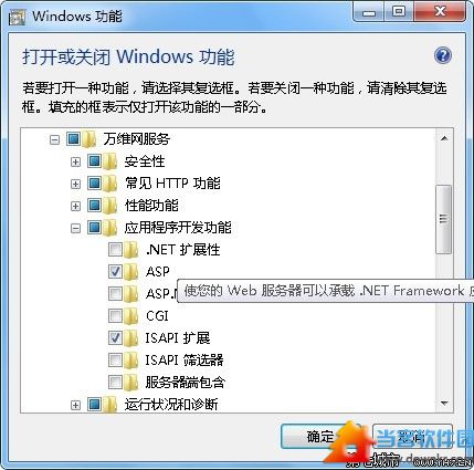 3、勾选ASP 和ASP.net选项 确定后安装完毕即可支持。