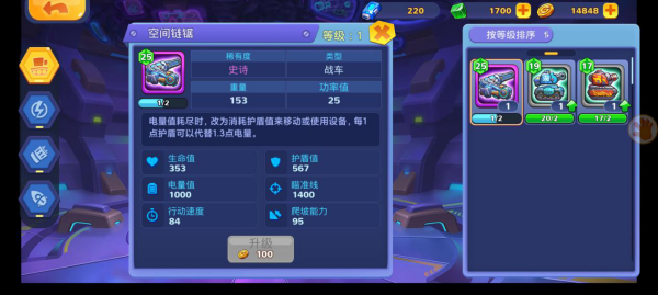 点击屏幕组装按钮,会进入组装界面。左侧依次排列可以选择机甲战车、设备、插件、炮弹。