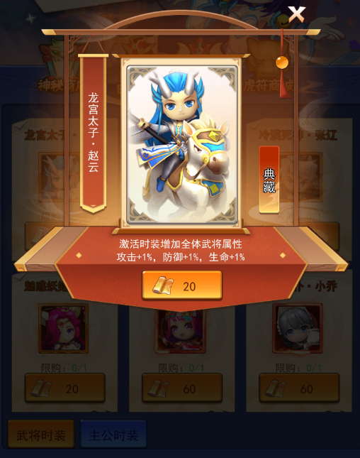时装商店,包含有酷炫的武将时装和不同国家的主公时装,需要消耗丝绸进行采购哦,快去每周特惠礼包查看获取吧!