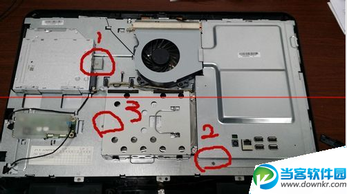 1、首先将电脑的所有外设去掉,像鼠标键盘什么的,网线也要拔掉,电源断掉。屏幕朝下放置 2、这时候可以看到两边有俩个十字螺丝孔,这里就我们使用十字螺丝刀的地方,把里面的螺丝完全扭开,一定要确保完全扭开,否则一下开箱的时候可能会损坏机箱。 3、在一体机的底座中间有一个活扣,在螺丝完全扭开的情况下,用力按下这个活扣,机箱下部会稍稍弹起一点。 4、机箱下部会稍稍弹起后,这里我们用准备好的硬卡片伸入弹出的空隙中,往上划。会再打开一点,然后就用双手用力掰开,就能把后盖取下来了。 5、去下后盖的一体机是这个样子的,1是光驱螺丝,2是主板螺丝,取下后这里可以看到内存,3是硬盘螺丝 6、处理好问题之后,就把后盖安上,安的时候,要注意要先把所有的活扣都扣好之后才能上螺丝,否则会可能螺丝扭上之后,机箱会有空隙,不美观。 |