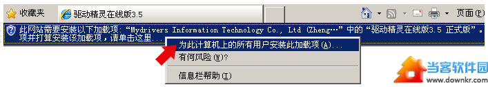 请单击 Internet Explorer 信息栏,点击安装此加载项。 在弹出的“安全警告”对话框中,请单击“安装”。 如果浏览器上方未出现黄色信息条,请点此手动安装安全控件>> 一、基于IE内核的安装: 驱动精灵在线版是驱动之家提供的一项免费驱动升级服务,通过智能检测本机硬件与对应操作系统,帮助用户获得本机硬件所需驱动,以发挥出计算机的最佳性能。驱动精灵在线版为基于ie浏览器的WEB服务,请不要禁用ie浏览器的 ActiveX功能,并点击允许IE安装驱动之家对应ActiveX功能组件。 如果没有安装此控件,驱动精灵在线版无法在计算机上正确显示。要安装控件,请执行以下操作: 1. 右键单击 Internet Explorer 信息栏。它位于地址栏的正下方。 2. 在右击菜单中,单击“安装 ActiveX 控件”。 3. 在“安全警告”对话框中,单击“安装”。 4.安装完毕后请点击键盘“F5”刷新浏览器 二、基于Chrome内核的安装 ※chrome下直接按提示点继续, 或将下载的crx文件拖入到chrome中 ※在弹出的窗口点击添加; ※安装完成后,如下提示,点击工具栏目上的图标,即可使用; 三、基于其它浏览器内核的安装 ※当使用非IE内核打开页面,点击立即体验; ※在弹出的窗口中,点击保存文件; ※下载完成后,双击文件启动安装程序; ※在弹出的对话框中点击安装; ※在弹出的对话框中点击完成后,即可使用; ※如果你正在浏览网站,软件会判断,点击“是”,你的浏览器会自动启动,即可使用; 四、运行驱动精灵在线版 现在驱动精灵已经成功安装,请双击“驱动精灵在线版”快捷方式,开始运行驱动精灵。或者,您也可以在Windows开始菜单—所有程序中,找到驱动精灵在线版的快捷方式。 这样,驱动精灵在检测中,耐心等待。 |