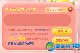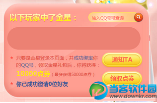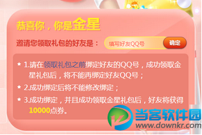 有疑问,看这里! 1、怎样判断谁是金星玩家? 在输入框中输入一个QQ号,即可出现该QQ号是否是金星玩家,如果是你就可以对他进行邀请咯。 2、怎样邀请好友领取礼包? 必须让你的金星好友在他的页面绑定你的QQ号,这样才能成功邀请,并领取点券哟! 金星玩家在此填入你的QQ号,就能成功绑定,此时,金星玩家再去领取金星礼包,领完金星礼包你就能获得10000点券哟。记住,一定要先绑定你的QQ号,再让好友领取礼包哟! 3、为什么显示出来的不是我的好友? 由于页面表达有误,页面自动显示出来的QQ号并不一定都是你的好友,也有随机出现的金星玩家,但是无论是否有被显示出来,只要是金星玩家,你都可以邀请他和你进行QQ号绑定,这样就可以领取10000点券。 4、是不是只有页面中显示的“我的好友列表”里面的金星才能被邀请? 不是的,页面上显示的只是一部分金星玩家,其他的金星玩家也可以进行邀请哟,大家可以通过自己的舞团、页面显示的QQ号、论坛、QQ好友等渠道寻找金星玩家,只要邀请回来,就能获得10000点券。 5、怎样领取10000点券? 当你成功邀请完好友后,即可在页面上领取10000点券咯,成功邀请1位金星得10000点券,最多获得50000点券。 6、赶紧来参加活动领取大礼包吧! qq炫舞4月幸运星活动网址:点击进入 |