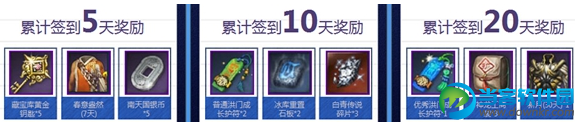 累计签到5天奖励:藏宝库黄金钥匙*5、春意盎然(7天)、南天国银币*5