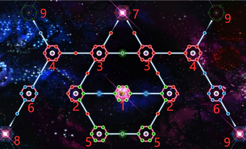 第四个结点,同样点周围的两圈红色,提高土花的输出能力;然后周围没有红色结点后,再回到下面去点绿色加生命值的结点,还有伤害减免,如此一来生存能力也能得到保证。