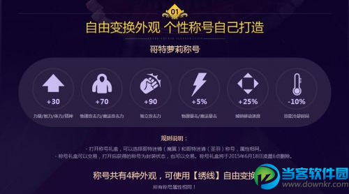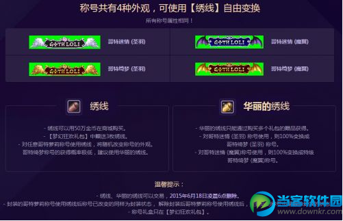 DNF在五一快来临开启了新活动,赶紧来看看DNF哥特萝莉派对活动介绍,哥特萝莉派对活动详情介绍吧,这次的活动内容十分丰富哦! 活动时间:4月23日—6月4日 活动地址:点击进入 规则说明: - 打开称号礼盒,可以选择哥特迷情(魔翼)和哥特迷请(圣羽)称号,属性相同。 - 称号礼盒可以交易,打开后获得的称号为封装状态,也可以交易。称号礼盒将于2015年6月18日凌晨6点删除。 称号共有4种外观,可使用【绣线】自由变换所有称号属性相同! 称号 哥特萝莉称号: 1.打开称号礼盒,可以选择哥特迷情(魔翼)和哥特迷情(圣羽)称号,属性相同。 2.称号礼盒可以交易,打开后获得的称号为封装状态,也可以交易。称号礼盒将于2015年6月18日凌晨6点删除。 称号共有4种外观,可使用【绣线】自由变换 哥特迷情 (圣羽) 哥特迷情 (魔翼) 哥特绮梦 (圣羽) 哥特绮梦 (魔翼) 绣线: 1绣线可以用50万金币在商城购买。 2 .【梦幻狂欢礼包】中赠送3枚绣线。 3.对任意哥特萝莉称号使用绣线,将随机改变称号的外观。 4.哥特绮梦称号的获得概率极低,建议使用华丽的绣线。 1华丽的绣线只能通过购买多个礼包的赠品获得。 2对哥特迷情 (圣羽) 称号使用,则100%变换成哥特绮梦 (圣羽) 称号。 3对哥特迷情 (魔翼)称号使用,则100%变换成特级哥特绮梦 (魔翼)称号。 温馨提示: 1.绣线、华丽的绣线可以交易,2015年6月18日凌晨6点删除。 2.封装的哥特萝莉称号使用绣线后称号已改变的同样为封装状态, 解除封装后哥特萝莉称号使用绣线后,变更后的称号也是解除封装的状态。 3.称号礼盒只在【梦幻狂欢礼包】。 |