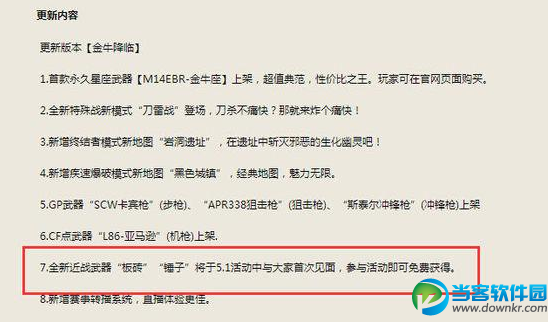 2015年五一劳动节即将到来,cf当然不可能错过这样的节日盛宴,2015年5.1cf会有什么活动呢?cf5.1活动有哪些奖励呢?下面赶紧跟小编一起到cf5.1活动网址去一探究竟吧! cf5.1活动网址暂未发布,请先收藏本网址,小编会在第一时间为大家送上更新!!! 最新爆料:CF新版本将加入铁锤武器新在五一活动中获得 穿越火线CF4月全新版本金牛降临新近身武器铁锤,作为全新种类的近身武器,铁锤具有2段攻击的特点,杀伤力十足. |