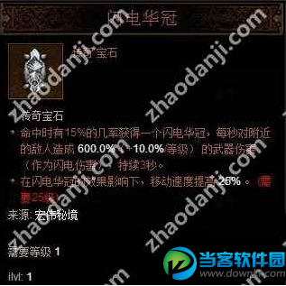 闪电华冠效果为有15%的几率对敌人造成600%(+10%等级)的伤害,同时提高25%的移动速度。