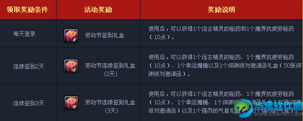 DNF五一签到活动开启啦!五一3天假期期间,签到即可领取给力大礼!DNF五一签到活动到底有哪些奖励呢?活动规则又是怎样的,赶紧跟着小编来一探究竟吧! 活动时间:22015年5月1日-5月3日 活动地址:http://dnf.qq.com/cp/a20150421ndjzh/index.htm 五一签到活动 2015年5月1日至5月3日,勇士每日登录即可签到领取给力奖励! ★【劳动节签到礼盒】使用等级为Lv1,其他签到礼盒使用等级为Lv50及以上。 五一经验活动 2015年5月1日至5月3日,勇士击杀怪物获得的经验值将会累积在经验池内,5月7日更新维护后可以领取对应的经验值胶囊 本次活动只累积击杀怪物经验值,不累积通关经验值。帐号内Lv20及以上的所有角色均可以累积经验值, 但是Lv50~Lv79的角色才能使用奖励的经验值胶囊。 五一越战越勇&疲劳值燃烧 2015年5月1日至5月3日,消耗疲劳值得Buff,同期开展疲劳值燃烧活动。 本次活动只累积击杀怪物经验值,不累积通关经验值。帐号内Lv20及以上的所有角色均可以累积经验值, 但是Lv50及以上的角色才能使用奖励的经验值胶囊。 温馨提示 1. 劳动节签到活动获得的【深渊派对邀请函礼盒】、【强烈的气息礼盒】将于2015年5月21日凌晨6:00统一删除,请及时使用; 2. 劳动节签到活动获得的【远古精灵秘药】、【魔界抗疲劳值秘药】保存期限为24小时,请及时使用; 3. 越战越勇Buff会在每日凌晨6:00重置,且以角色维度参与活动; 4. 在亡者峡谷、南部溪谷、逆袭之谷、决斗场内不会触发越战越勇Buff; 5. 签到活动和经验活动是以帐号维度参与并领取奖励。 |