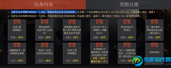 cf5月2.0赏金令活动开启啦!CF5月2.0赏金令活动时间是2015年4月29日至2015年5月13日,活动期间,玩家在任务周期内每完成一个任务,即能获得该任务对应的奖励,更有银币兑换奖励,各种武器等你来拿,还不快来看看! 活动时间:4月29日-5月13日 领取时间:4月29日-5月13日 活动地址:http://cf.qq.com/act/a20141201mission/index.htm 任务内容: 1、玩家在任务周期内每完成一个任务,即能获得该任务对应的奖励,本月第一个任务周期为4月1日12:00-4月15日12:00。(赏金猎人银币、道具) 奖励兑换: