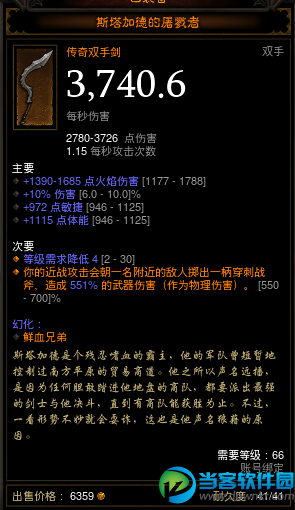 随着国服的开启,无论是论坛还是游戏的综合聊天中,总会有新手朋友问及武器选择的问题。武器,可以说作为全身所有装备中的根基,的确有必要弄明白,到底如何选择才更加合理。 随着各位玩游戏的逐渐深入,一定会发现,D3是一款充斥着各种数值计算的游戏。甚至有玩家会觉得玩D3好比在做数学题。本人并非数据帝,也觉得玩游戏不应当变成做数学。然而,很多基础的东西,如果不弄明白,将会玩得一头雾水,同样会少很多乐趣。这也就是为什么我要给新手朋友分享认知一把武器的方法,因为它是基础中的基础。 武器白色的数字越大,表示武器一定越好? 理论上这句话并没有错。这也是很多新手朋友拿到武器唯一的参考依据——就是看大白字。只要看到比手上的数字大,就换上。另外一条新手朋友常用的参考依据是换装时的对比,如果是绿字显示的增加伤害,就换上。这种方法只能说大方向没有错,但并不绝对。大家必须明白,所谓武器的大白字其实是计算得到的结果。如何计算?就是下面要说的。 认知一把武器的关键:DPH和攻速 这是游戏中随便截取的一把武器。 3740.6就是俗称的大白字,其实它表示的是一把武器的DPS(Damage Per Second),也就是每秒伤害。它是如何计算得来的呢? 注意到下面一行 2780-3726, 将他做一个平均,也就是(2780+3726)/2 =3253,它表示这把武器的DPH(Damage Per Hit),也就是每击伤害。顾名思义,你在战斗中每次攻击(释放技能)造成的伤害其实是基于这个数值的。再下面的1.15 就是这把武器的攻速。表示平均每秒种,这把武器可以攻击(释放技能)1.15次。明白这些,就可以计算3740.6了,大体来说,每秒伤害=每击伤害*攻速,也就是 (2780+3726)/2*1.15=3740.6(有误差)。 其实真正会玩的朋友,拿到一把武器通常是不会看大白字的,而是看下面的武器DPH和攻速,再根据自身的技能、打法等等,来决定是否使用这把武器。 更加详细的解析 武器显示的伤害区间(DPH)其实也是一个计算得来的结果。 以上面这把武器为例,“2780-3726”其实是:武器的底板伤害 加上“1390-1685点火焰伤害”再乘上“+10%伤害”得到的。什么是底板?当你打到一把传奇武器,还未鉴定之前,它的大白字下面的那行伤害区间就是底板伤害。或者你找到铁匠,当你要打造一把武器的时候,也能够看到这把武器的初始底板伤害,如下图: 红色圈出的部分就是底板伤害。一般来说,同一类型的武器(比如单手剑),它的底板伤害和底板攻速都是固定的。 那么,假设你拾取了一把传奇单手剑,它的底板伤害是 168-392 ,它的底板攻速是 1.4 ,这时你通过鉴定,随机到的伤害是 “1000-1200点冰寒伤害”(假设),还有一条属性是 “+8%伤害”(假设),那么这把武器的DPH就应该是:“(168+1000)*(1+8%) —(392+1200)*(1+8%)”,最终显示出的结果就是 “1261-1719点伤害”。 武器攻速和其它装备攻速的关系 上面一段我们知道了每一种类型的武器都有其初始的攻速(比如单手剑是1.4),那么如果你的武器随机到一条加攻速的属性,又将如何呢?如下图:
