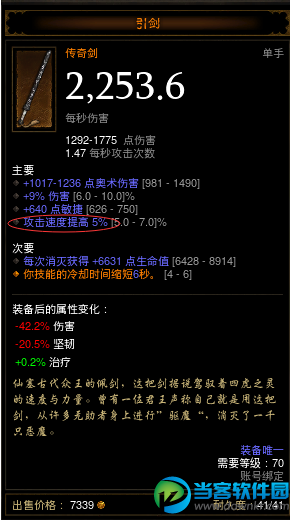 这时可以发现这把剑的攻速变成了 1.47 ,很简单,因为单手剑的基础攻速为 1.4,1.4*(1+5%)=1.47。 这样,我们基本上弄明白了绝大多数武器的DPH、攻速的构成原理,我们在捡到一把武器的时候,再也不用盲目地去看“大白字”去判断这把武器的好坏了。值得注意的是,武器上的“攻击速度提高X%”和其他装备上的“攻击速度提高X%”是不同的。归纳为一句话就是:武器上的攻速提升以乘法计算,其余装备的攻速提升先全部相加,再算乘法。 举例:比如你现在手上拿着这把引剑,然后你的一个戒指上有“攻击速度提高6%”,手套上有“攻击速度提高7%”,那么你的人物的攻击速度就应该为: 1.4*(1+5%)*(1+6%+7%)=1.66 或者简单一点,直接用你的武器显示的攻速(每秒攻击次数)乘上其它装备的攻速之和,就是你的人物攻速,即: 1.47*(1+6%+7%)=1.66 武器上的各种元素伤害有区别吗? “+XXXX-XXXX点(火焰、冰寒、奥术、神圣……)伤害” 这类的元素伤害的描述,在计算之中都是没有任何区别的。而且技能所属的元素皆以技能符文上的描述为准,武器上的元素并不造成影响。(只有在极少数情况下,武器上的元素才会带来一些效果,新手朋友可以忽略。) 双手武器和单手武器各自的优劣? 在通常情况下,双手武器和单手武器可以进行如下的对比: DPH:双手通常高于单手。同样的技能,如果都释放一次,那么双手打出的数字一般来说是比单手要高的。 攻速:单手通常快于双手。无论是从攻击动作还是施法动作来说,都可以明显感觉到,带单手武器时动作更快、操作也更加流畅。 攻速一定越快越好吗? 其实并不能这样说。如果大家经常逛论坛看帖子,会经常看到有人说“攻速没用”、“攻速是虚的”、“面板虚高”等等说法。至于攻速为什么是“虚的”也许并不是每个人都能完全解释清楚。前几天一个新手朋友问我:“为什么我面板伤害这么高了,但打出来的数字并不高呢?”他玩的是猎魔人,拿着一把单手弩枪。这就很好解释了,弩枪是猎魔人武器中典型的"攻速快、DPH低"的代表,拥有1.6的基础攻速,但DPH并不高。我们经常看到一把“大白字”相当高的弩枪,其实大多是攻速的贡献,弩枪的优势在于速度快,而如果你要追求每一下打出去的伤害高、数字好看,那么选择弩枪就不太适合了。 攻速快的优势有哪些呢?显然攻击、施法速度快这不必多说,另外攻速快意味着使用触发频繁,无论是击中回血,还是触发其他一些传奇的特效,攻速快些显然更具优势。 那么劣势呢?除了造成面板伤害“虚高”的假象以外,攻速越快,消耗能量也会越快。如果你使用的是经典的“左键产能、右键耗能”的输出方式,那么更快的攻速则意味着更快的能量循环。 技能描述中的“造成XX%武器伤害”到底应该如何理解? 大多数情况下,应该理解为每释放一次该技能,造成基于你的DPH的XX%的伤害。这里的“武器伤害”如果说得更准确一点,其实应当是“经过放大之后的武器伤害”。你全身所有装备所带来的主属性、爆率、爆伤等等,都对你的武器DPH有“放大”的作用,而技能所造成的这一伤害,就是基于经过“放大”之后的武器伤害来计算的。 根据你的技能,合理选择武器 我习惯于将所有技能大致划分为两大类(当然实际中所有技能不可能只划分成两类这么简单):站桩持续输出技能和非站桩技能。 站桩持续输出技能最典型的代表就是各职业的“主要技能”,基本都可以划归为这一类。这一类的技能一般需要站定,持续不断的对敌人进行攻击。这时候,DPS就成为衡量你的输出的指标了,因为你在持续不断的攻击,那么显然攻速越快,输出就会越高。如果你的伤害大多数是源于这一类型的技能,那么在选择武器时就需要看重一把武器的DPS(大白字)。 而非站桩技能就不同了,这类技能要么具有冷却时间,要么受到你能量的制约,使你不可能一直站在原地不停地释放这类技能,当技能进入冷却或者你的能量耗尽,你就不得不走位、换用其他技能、等待冷却了。对于这一类技能,DPH才是衡量它们的重要指标,因为这个时候,无论你的攻速有多么快,你也不可能使冷却中的技能立即可以使用,也不可能在空能量时继续释放该技能。如果你的伤害来源主要是这类技能,那么在选择武器的时候,就千万不能被武器的DPS(大白字)蒙蔽了双眼,而应更加关注武器的DPH值,也许,双手武器会是更加合适的选择。还有一些技能,其本身就是和攻速没有任何关系的,比如大部分DOT类技能(持续伤害类),这时堆高攻速同样是没有作用的。 孔是武器的必须 可以这么说,一把没有孔的武器,基本可以算作残废。因为绿宝石带来的暴击伤害的提升是非常巨大的。这也就是打孔器为何备受大家追捧的原因。有了打孔器,可以给原本没孔的武器打孔,而且会比天生自带孔的武器多出一条属性。因此一把“毕业”级别的武器所具备的首要条件应当是自身不带孔,然后使用打孔器打孔之后的武器。 特效是武器的灵魂 这是一个特效大于一切的时代,一把传奇武器的某个特效,也许就可以支撑起一种玩法、一个流派。因此在选择武器的时候,很多情况下,武器的特效才是第一位需要考虑的,而DPH等参数,反而要靠后了。D3中有很多“明星”级别的武器(至于有哪些,就不一一列举了),这些武器往往拥有无可替代的特效,很多时候,即使属性并不太好,也会成为首选。这就需要各位在游戏中慢慢摸索和学习了。 