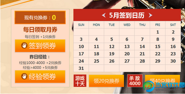 CF穿越火线5月军火基地又准时的和各位小伙伴们报道了,这次的军火基地活动又给玩家们带来了哪些给力道具了?翔龙妖姬等你来拿!一起来看看吧 CF军火基地活动网址(2015年5月) 活动时间:2015年月5日-5月31日 每日领取月券: 每日签到 +1兑换券 昨日经验: 经验1000-4000 +2兑换券 经验≥4000 +5兑换券