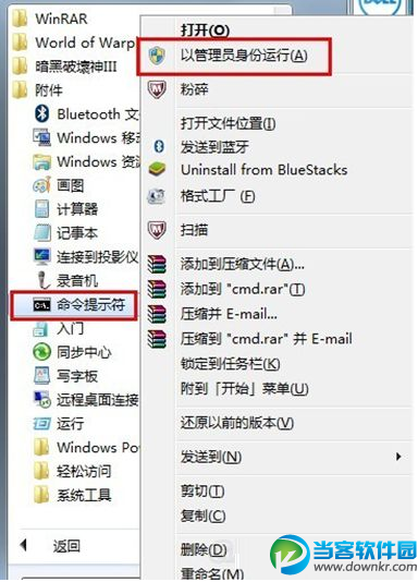 依次单击“开始,所有程序,附件”,然后右击“命令提示符”,选择“以管理员身份运行”:
