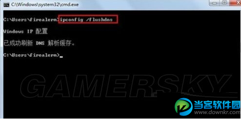 在命令提示符窗口处输入ipconfig /flushdns后回车:
