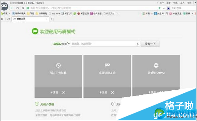 平时上网冲浪,不希望自己上网的浏览记录、上网痕迹被别人看到,这时候需要手动清空浏览历史记录,删除浏览痕迹,但是这样做显得非常麻烦。有没有一种自动清空浏览记录呢?不需要手动删除浏览记录的方法呢?还真有,那就是360安全浏览器无痕浏览模式!那么,怎么设置360浏览器无痕浏览模式呢,在哪里?今天小编来给您详细解答360无痕浏览设置方法教程吧~ 首先,打开360安全浏览器,然后点击右上的【文件】——【新建无痕/小号窗口】,如下图。 ![]() 然后就会新建一个无痕浏览窗口,在这个窗口打开的任何网页就是没有浏览痕迹的了。同时可以看到360无痕浏览的三个设置选项:强力广告过滤,360无痕模式桌面快捷方式、老板键。 ![]() 怎么设置360浏览器无痕模式——强力广告过滤功能 单击灰色的“强力广告过滤”功能窗口。即可开启360浏览器过滤广告功能。 ![]() 然后,你可以打开一个弹窗严重的网站实验,发现果然平时开一个网页弹出3个网页的情况没有出现,无任何广告弹窗,实在是高。 ![]() 怎么设置360浏览器无痕模式——设置无痕浏览快捷方式 单击开启【桌面快捷方式】功能。 ![]() 然后在桌面就会看到一个开门见山的无痕浏览快捷方式。直接打开他上网就是无痕浏览啦! ![]() 怎么设置360浏览器无痕模式——设置360浏览器老板键 单击开启360浏览器老板键功能。如下图。 ![]() 这是我打开360安全浏览器时候任务栏显示情况。 ![]() 然后我按下老板键Ctrl +Q,然后就会发现浏览器突然消失啦啦!任务栏什么都木有!老板一看就觉得:嗯,小子不错,工作很认真嘛! 360无痕浏览怎么关闭? 关于如何关闭360无痕浏览模式,直接打开正常的360安全浏览器即可,这时候左上角显示的不是【无痕/小号浏览】即可保留浏览记录。 |