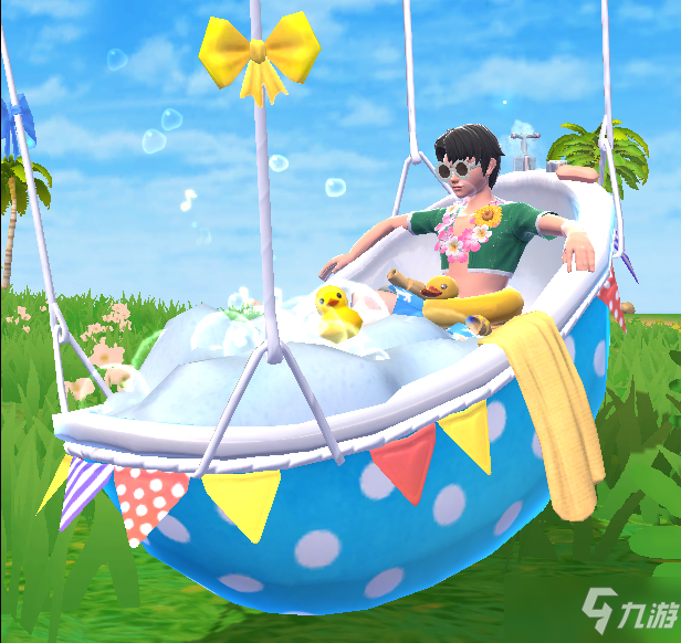 泡泡浴缸上方是两个巨型泡泡,在阳光照耀下拥有耀眼七彩光芒。下面绳结拴住浴缸,周围有彩旗装饰,浴缸内则被纯白绵密的泡沫填满。但是!最亮眼的要数这只一直游动的小黄鸭啦,超级可爱!