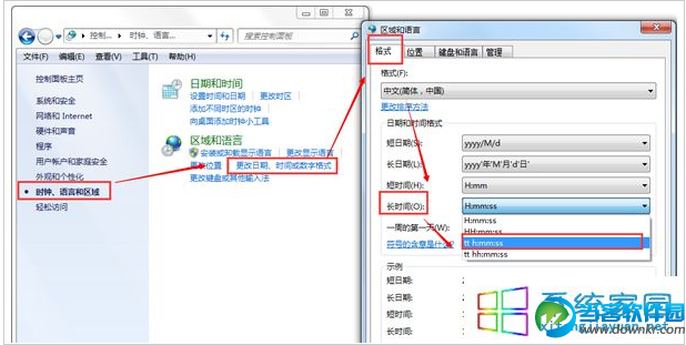 win7系统是微软公司推出的一款功能强大的系统,除了常规的功能之外,用户还可以自定义桌面背景,也可自动切换。除此之外,其实我们还可以设置win7系统任务栏通知区域显示指定的名字,具体的设置方法是什么呢?下面一起来了解下吧! 方法如下: 1、在Win7系统中打开控制面板并选择“时钟、语言和区域”选项; 2、选择“区域和语言”下的小选项“更改日期、时间或数字格式”; 3、将“长时间”后的下拉选项“H:mm:ss”更改为“tt h:mm:ss”或者“tt hh:mm:ss”,点击应用; ![]() 4、点击右下角的其他设置,选择“时间”后,将“AM符号”和“PM符号”后的文字更改为你想要的文字; ![]() 5、点击确定设置完成,返回桌面查看效果。 |