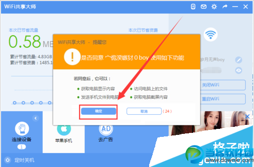 怎么让手机远程控制电脑呢?下面小编就来教大家WiFi共享大师怎么让手机控制电脑的方法。 首先下载好WiFi共享大师 打开运行这款软件。在主界面单击【手机控制】按钮。如下图所示。 ![]() 然后在弹出的窗口,用手机进行扫描二维码。如下图所示。 ![]() 然后在手机上下载安装【远程控制大师】这款应用。如下图所示。 ![]() 安装成功后,在手机上打开运行【远程控制大师】,然后点击【申请授权】按钮。如下图所示。 ![]() 这时候在电脑上会弹出一个提醒窗口,单击【确定】按钮,进行授权。如下图所示。 ![]() 这样手机和电脑就连接成功了,就可以使用手机来控制电脑了。如下图所示。 ![]() 在手机上点击右下角的【控制电脑】按钮,如下图所示。 ![]() 在弹出的界面,就可以点击【遥控关机】按钮来关闭电脑,或者点击【抓屏幕】来获取当前电脑的屏幕,等等。而且即将还要推出控制摄像头的功能。如下图所示。 ![]()
