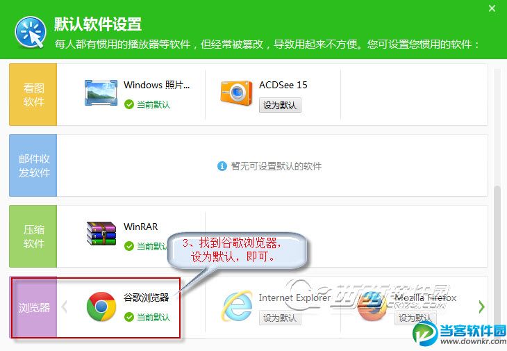 3、打开360安全卫士,“默认软件设置”面板,如下图: