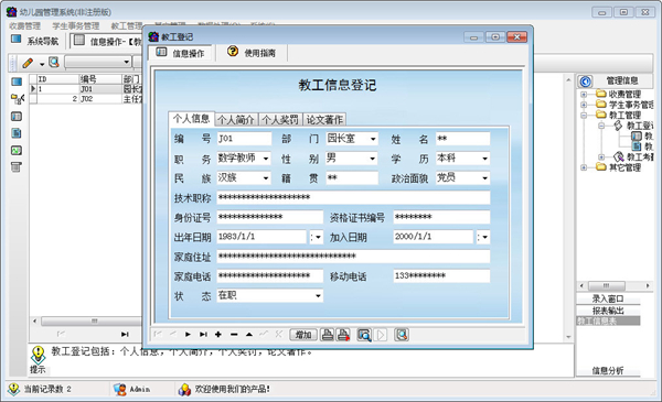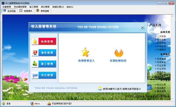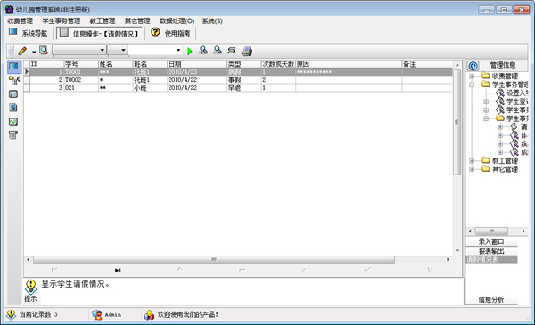 宏达幼儿园管理系统是一款非常好用的管理软件。这款软件可以帮助教师及园长对幼儿园进行有效管理,可以录入不同收费项目的收支明细,还能对学生资料、请假等进行信息登记。具有学园收费、学生事务管理、教工管理等功能。 软件功能 学园收费、学生事务、教工管理等业务,内容涵盖收费管理、收费记录、设置收费时间。 学生事务管理、学生资料登记、学生请假情况、体检情况、疾病情况、成绩情况。 教工管理、教工登记、教工考勤。 其它管理、学生人数登记、疫苗管理、学生奖励等进行全面管理的系统。 软件特色 系统提供了各种管理的查询功能和报表功能,它集输入、维护、查询、筛选、统计和各种处理为一体,信息导入导出方便共享。 灵活、专业的报表设计,形象、增强的数据处理,操作快捷、方便,性能高效、强大。 使用易懂、易会,为幼儿园管理提供了一个现代化的管理手段。 保持了各种数据的完整性、及时性和正确性,完善了管理体系,提高了管理水平。 |