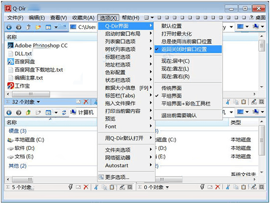 Q-Dir是一款好用的资源管理器,使用该软件可以方便轻松管理各种文件,软件内置四个文件夹整理窗口的文件管理器,用户可以根据自己的需求选择,软件界面简洁,操作简单易上手,使用起来非常方便,有需要的用户快来下载体验吧。 软件特色 1、快速访问最常用的文件夹; 2、可以通过拖拽移动文件到个窗口; 3、在Q – dir目录视图和其他程序之间的复制/粘贴; 4、支持文件夹类型: ZIP 、FTP、网络、系统文件、快捷方式; 5、文件过滤器:允许的项目快速,轻松过滤; 6、所有栏目的支持保存功能; 7、对于快速文件夹访问权限; 8、浏览视图:大图标、小图标、列表、详细、缩略图; 9、允许快速预览; 10、有多种颜色供不同项目类型。 安装步骤 1、在本站下载Q-Dir压缩包并解压,运行安装程序,首次启动 Q-Dir 时会要求选择语言,点击上方的中国国旗即为简体中文版; 2、根据自己需要进行设置,然后选择文件安装目录,用户可以选择默认安装位置也可以点击“更改”,自定义选择位置,然后点击“安装”; 3、安装完成后就可以使用软件了。 使用教程 1、打开Q-dir出现的四个窗口,不同盘中在同一个窗口访问多个文件夹针,对文件加中的内容进行复制、粘贴、修改、移动等操作; 2、选择“选项”——Q-dir 界面——返回关闭时窗口位置,这样下次打开的时候是上次关闭时的状态。 自动修复四元浏览器中的小错误。 Windows 10和MS-Server中Q-Dir的一般改进。 语言文件的更新。 |