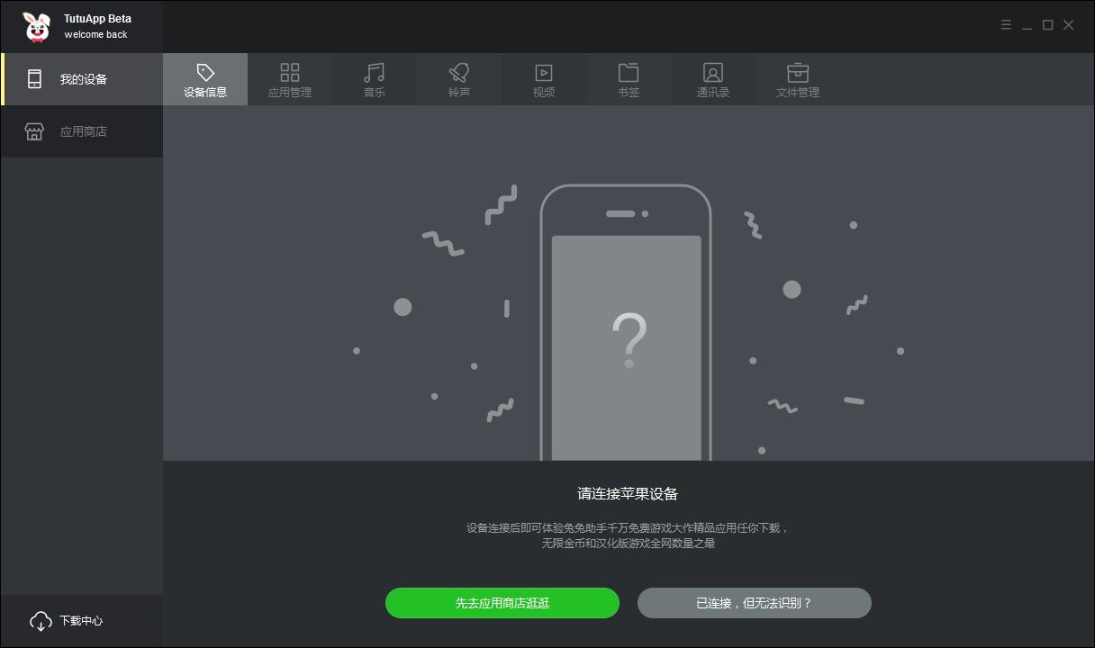 兔兔助手电脑版是一款为iOS手机助手,又名tutuapp,兔子是敏捷、可爱的象征,而且擅长于跑步,这也恰恰符合兔兔助手电脑版要为用户量身定制一款最便捷、最灵敏、最好用的手机助手的宗旨,欢迎大家下载使用。 功能介绍 1、应用市场 为越狱设备提供超过百万的优质app,全部免费。拥有国内外最火爆的应用和游戏,囊括全球资讯的新闻中心,精彩好玩就是我们。 2、数据迁移 助手中第一个推出领先牛技,更换设备从此摆脱数据线,只需wifi轻松扫描二维码即可实现 iOS和andriod双平台之间的数据互通。 3、清理专家 集合内存加速和垃圾清理为一体,智能进程清理策略,全力释放内存,手机加速,容量减负,焕然一新。 4、工具箱 工具箱提供了电池管理,系统信息查询,手机通讯录备份,wi-fi安装等超实用功能,让设备实用了非常便捷,至少省去了5款app占用。 软件特色 1、一键安装 告别繁琐,最简单的操作告别闪退,最随心所欲的IOS体验。 2、极速下载 最大化的下载速度,极致的流畅体验,精彩一触即发。 3、实用工具 更贴心更人性化的管理工具,让设备体验更加方便快捷。 4、海量资源 百万正版资源,轻松安装国内外最火爆的应用和游戏,抢先体验。 安装步骤 1、双击运行兔兔助手安装程序,选择语言; 2、点击【自定义安装】按钮选择安装目录和用户数据目录; 3、单击【安装】开始安装以后即可开始安装; 4、等待安装; 5、安装完成即可打开兔兔助手。 使用方法 兔兔助手电脑版越狱教程 一、准备工具 1、兔兔助手越狱工具(支持iOS 6.0-9.0.2系统); 2、电量不低于50%的iOS设备; 3、USB供电接触接口良好的Windows电脑。 二、越狱前须知 1、越狱之前防止丢失资料,请预先备份; 2、本次越狱兼容所有iOS 9 -- iOS 9.0.2 的设备,暂不支持iOS 8.4.1(升级教程请查看文章末尾); 3、越狱时候请退出电脑的itunes; 4、OTA升级的用户,请重新刷机恢复之后再进行越狱(否则容易出现Cydia闪退和图标丢失等情况)。 三、越狱前设备操作 1、 越狱前务必在设备”设置”—“iCloud”—关闭“查找我的iPhone”; 2、越狱前务必在设备”设置”— ”TouchID与密码”— ”关闭密码”。 四、正式越狱 1、打开下载的兔兔越狱助手,设备识别之后点击开始越狱(一键越狱按钮在一键刷机旁边,灰色的可点击); 2、点击“我已经备份”; 3、越狱过程中需要根据提示打开飞行模式(手机端从HOME键往上滑动,点击飞机按钮就可以了); 4、盘古越狱进行至“请解锁设备,点击桌面上的《盘古》图标 ”时,请打开iOS设备,点击屏幕的“盘古”图标,点击“Accept”按钮,在弹出【“盘古”想访问您的照片】对话框点击【好】; 5、越狱成功,继续等待进度条走完,就越狱成功了。 常见问题 1、兔兔助手正版和VIP版有什么区别? 兔兔助手正版和VIP版是两种不同的签名机制,VIP版能保证游戏不闪退,可以自已修改游戏资源存档等等,而且在资源上比正版要稳定且多得多,除了Pokemon Go,我们还有许多汉化修改游戏提供。如果VIP用户有特别想玩而我们还没有上的游戏,可以跟我们的客服申请,我们会尽可能地满足用户的需求。 2、下载精灵宝可梦GO提示准备中。 这个也是VIP版针对游戏做得一些调整,保证让用户不会被苹果官方限制,准备完成后,能根据自已的网速畅快下载。如果遇上下载精灵宝可梦GO的高峰期,准备时间也会随着下载人数增多而加长,所以您需要等待较长的时间才能下载。 3、提示无法连接tutuapp.com或者显示服务器错误。 这是由于服务器繁忙导致。请多刷新页面,或者切换成自已的网络。 4、提示下载精灵宝可梦GO失败。 由于下载人数过多,会有无法获取服务器信息的情况。此时可以退出兔兔,重新打开,重新下载,多尝试就可以下载了。 |