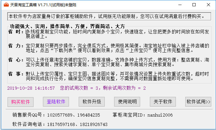 天音淘宝工具箱可快速清理无引用的图片,为图片空间减肥省钱;软件先搜集出售中所有宝贝图片,然后再执行删除;软件也可还原和永久删除回收站图片。 软件功能 省时:多线程复制宝贝功能,短时间内复制多个宝贝,快速稳定,让您把更多的时间放在如何发展店铺上。 省力:宝贝复制只要两步操作,完全傻瓜方式,使用极其简便。淘宝地址栏中输入被上传店铺的地址,点击“下载列表”便可以看到效果;点击“上传宝贝”便可上传完整信息。 省心:可以上传任意淘宝店铺的宝贝,数据准确。支持多种上传方式,使用方便:整店复制、淘宝分类复制、搜索关键字复制、单个宝贝复制、集市商城分类搜索复制。 省事:默认上传宝贝属性、宝贝主图、描述图片等,并可依情况设置上传失败重试次数,超时时间和完成执行任务,确保宝贝信息复制完整,不需要再对数据重新处理即可使用。 软件优势 1、搜集宝贝图片过程自动保存进度,支持断点续传功能,保证所有页数的宝贝都能采集下来; 2、搜集宝贝遇到重复宝贝时可循环搜索店铺多次; 3、搜集图片链接采用内存流即时读写方式,支持百万以上的图片数据存储,支持出售中2万以上宝贝的删除图片。 |