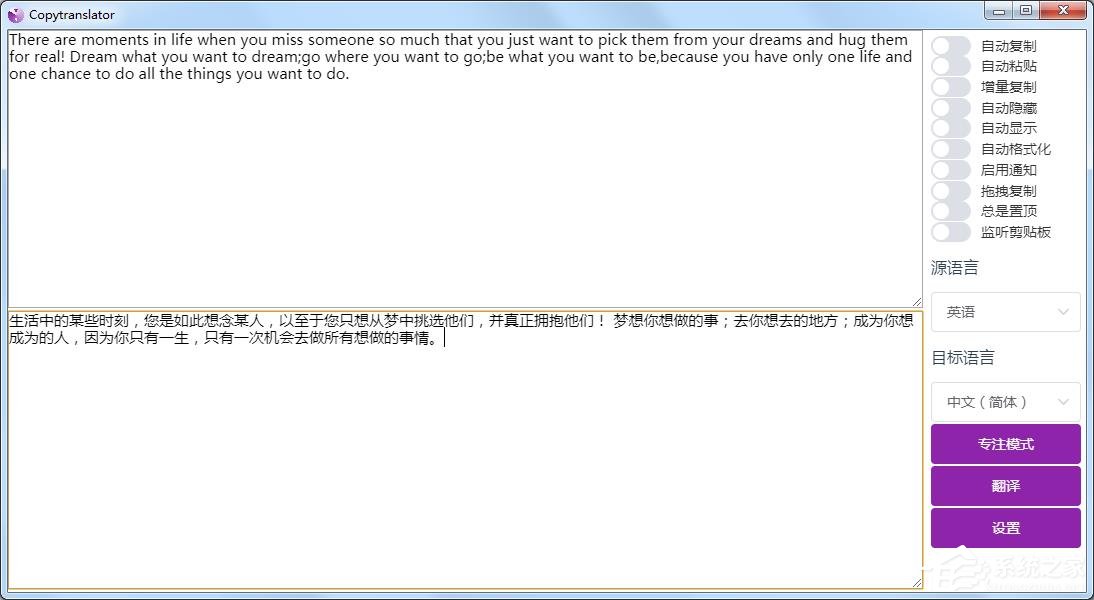 专注模式只提供译文窗口,便于您关注译文。使用专注模式时注意勾选始终置顶及监听剪贴板,必要时应勾选自动复制。